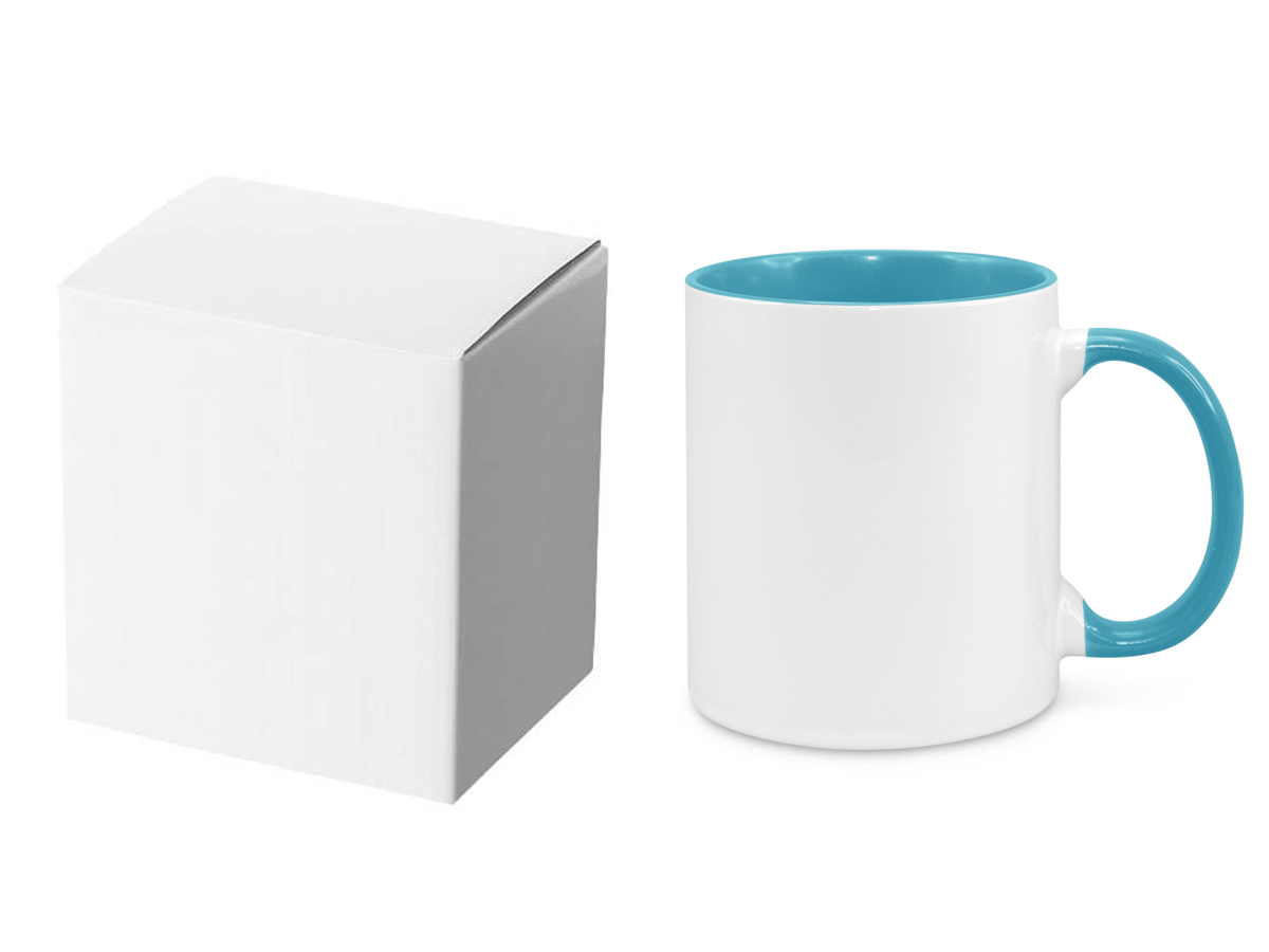Cană ceramică sublimabilă, exterior alb lucios, interior şi toartă albastru lucios lucios, diametru 83 mm, înălţime 98 mm, volum 380ml (11 oz), greutate 330 g, cutie individuală albă.