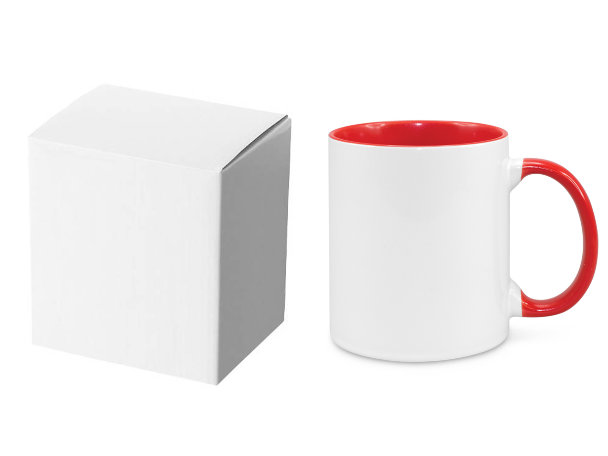 Cană ceramică sublimabilă, exterior alb lucios, interior şi toartă roşu lucios, diametru 83 mm, înălţime 98 mm, volum 380ml (11 oz), greutate 330 g, cutie individuală albă.