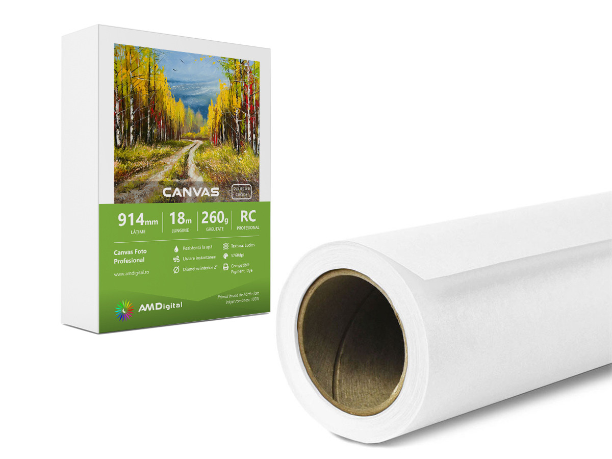 Canvas poliester, lăţime rolă 914 mm (36 inch, A0+), lungime rolă 18 m, diametrul interior al rolei 2'', textură lucioasă, rezoluţie maximă 5760 dpi, greutate 260 g/mp, grosime 350 microni, uscare instantanee, rezistent la contactul cu apa, compatibil cu imprimantele inkjet care utilizează cerneală pigment, dye, ecosolvent, latex sau UV.