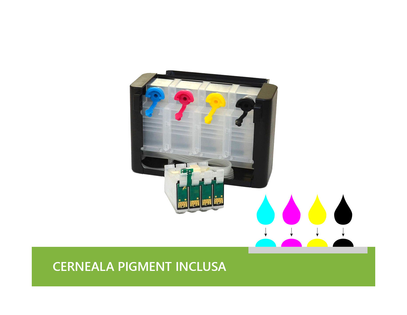 CISS cu 4 culori cu capacitatea de 110ml/culoare, cip de 7,4ml/negru şi 5,5ml/color cu buton de resetare, compatibil cu Epson D78 şi alte serii de imprimante, cod cip-uri T0711-T0714 şi 400ml cerneală pigment.
