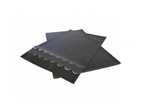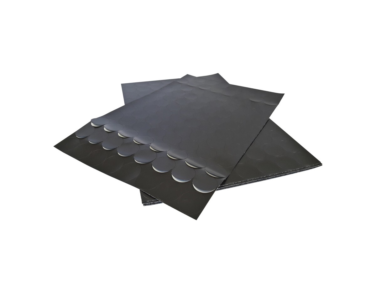 Pastile magnetice adezive, grosime folie magnetică 0,3 mm, grosime cu adeziv inclus 0,4 mm, dimensiune coală 200 x 300 mm, diametru pastilă 24 mm, număr de pastile pe coală 96, forţa magnetică ≧ 14 g/cm2, adeziv pe bază de apă.