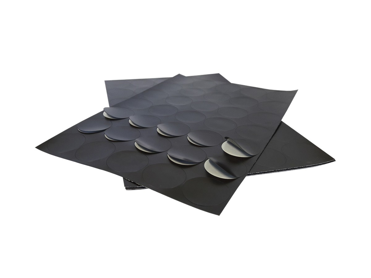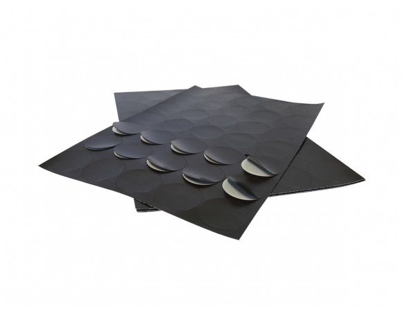 Pastile magnetice adezive, grosime folie magnetică 0,3 mm, grosime cu adeziv inclus 0,4 mm, dimensiune coală 200 x 300 mm, diametru pastilă 38 mm, număr de pastile pe coală 35, forţa magnetică ≧ 14 g/cm2, adeziv pe bază de apă.