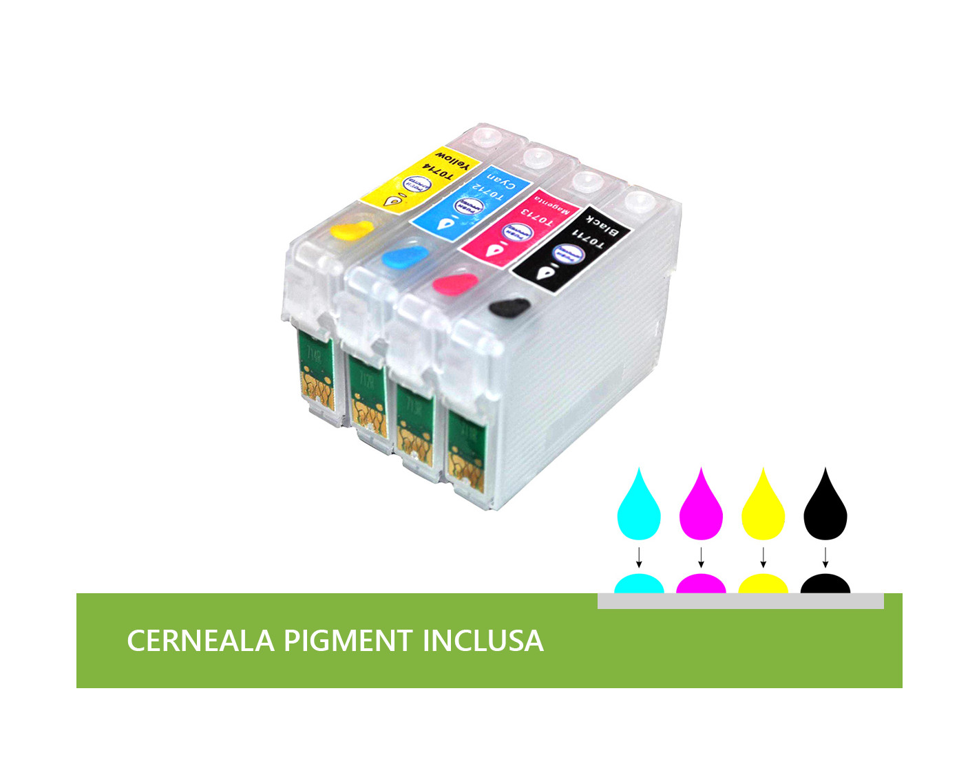 Set cartuşe refill 4 cartuşe cu capacitatea de 12ml/cartuş, cip autoresetabil de 11,2ml/negru şi 7ml/color, compatibil cu Epson SX425 şi alte serii de imprimante, cod cip-uri T1291-T1294 şi 400ml cerneală pigment.